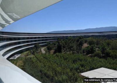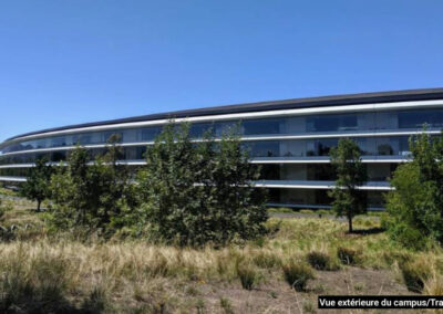 L’Apple Park se distingue par son bâtiment principal en forme de cercle, souvent surnommé le « vaisseau spatial ». Ce design innovant favorise l’ouverture et la collaboration, créant un environnement de travail exceptionnel pour plus de 12 000 employés.