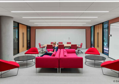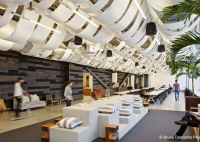 Dropbox a mis un point d’honneur à concevoir des espaces qui favorisent le bien-être. Le bâtiment est doté de zones de détente, d’espaces dédiés à la méditation, de salles de sport, et d’une cafétéria proposant des repas équilibrés. Chaque étage est aménagé pour offrir aux employés des environnements adaptés à des moments de repos, de concentration, ou de collaboration active.