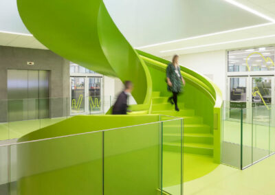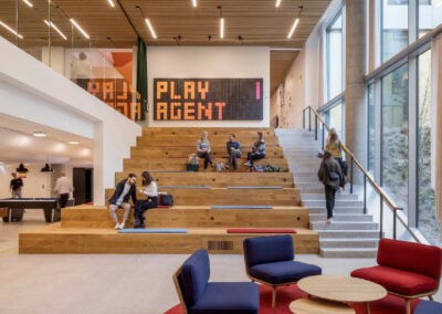 Le siège social de LEGO se distingue par son design ludique inspiré des célèbres briques LEGO. L’intérieur est rempli d’éléments colorés, de structures modulaires, et d’espaces interactifs qui stimulent la créativité. Les employés évoluent dans un environnement où l’innovation est encouragée à travers l’aménagement même des lieux, avec des espaces flexibles qui favorisent le travail collaboratif.